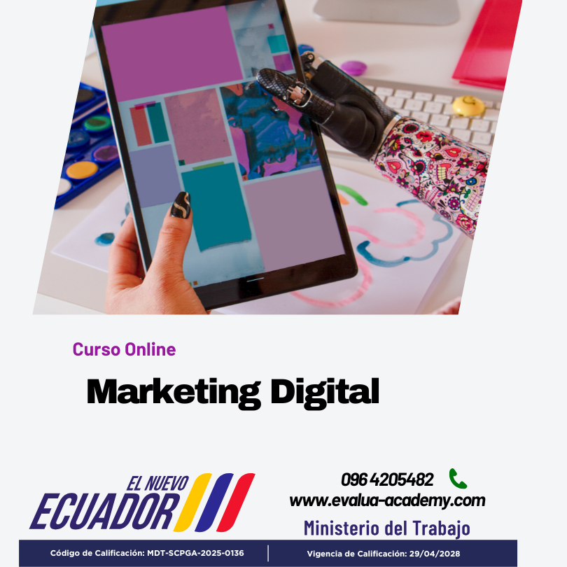 Objetivo: Capacitar en el desarrollo competencias en marketing digital, por medio del conocimiento de la planifición, implementación y optimización de campañas en medios digitales, publicidad en redes sociales, marketing de contenido y analítica web, para mejorar la visibilidad y ventas }en el entorno digital de un producto o servicio.